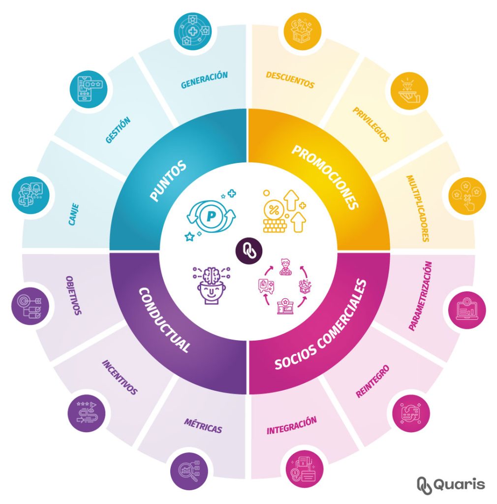 Quaris ofrece una suite Modular, Escalable e Integrada. Para que bancos, fintechs, y servicios masivos diseñen sus programas de Fidelización, Recompensas y Experiencia del cliente.